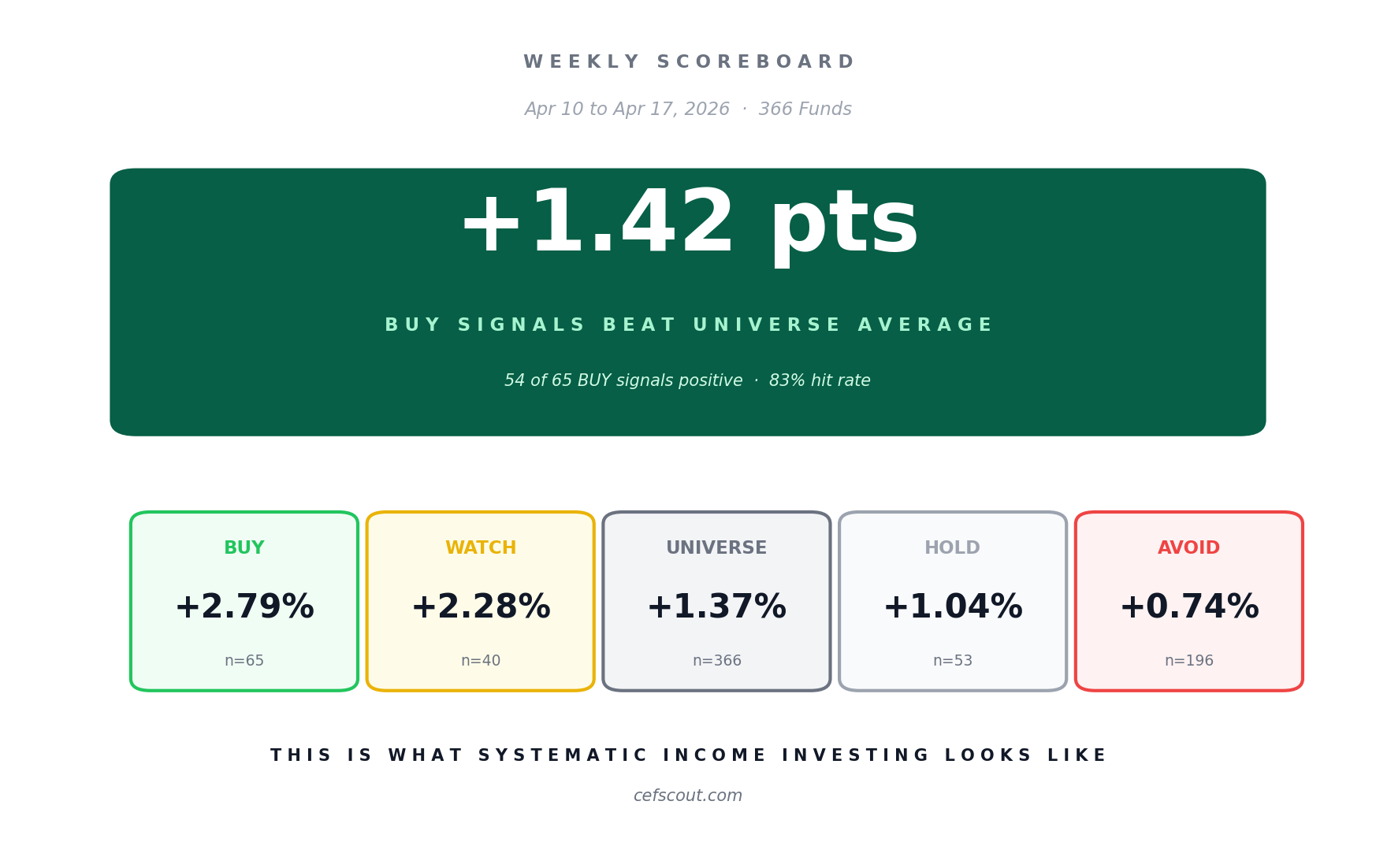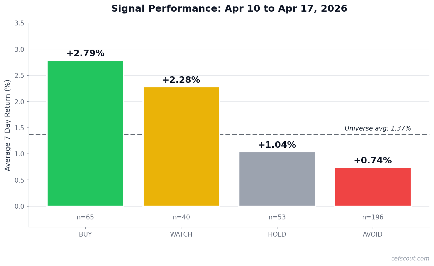 Methodology: Returns shown are 7-day price-only returns. They do not include distributions paid during the window. For income funds with stable monthly distributions, this understates total return for BUY-rated funds (which reliably go ex-dividend) relative to AVOID-rated funds (whose distributions are at risk). Distribution-adjusted total returns will be added in a future release. The relative ordering of signal performance is unaffected.