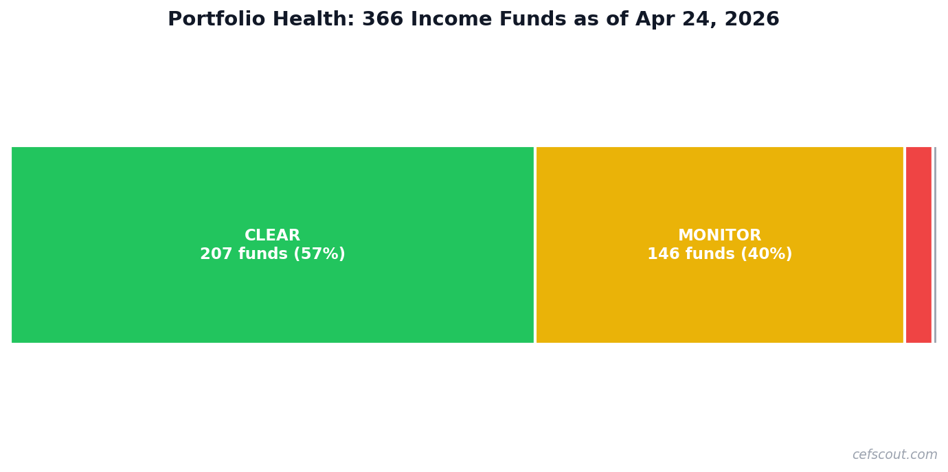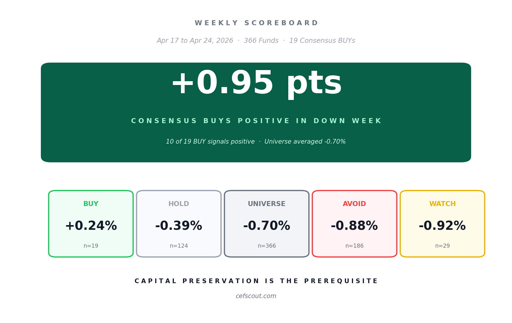 Week of Apr 17 to Apr 24, 2026. Universe size: 366 funds. Consensus BUYs: 19 (where Timing, Academic, and Health checks all agree).