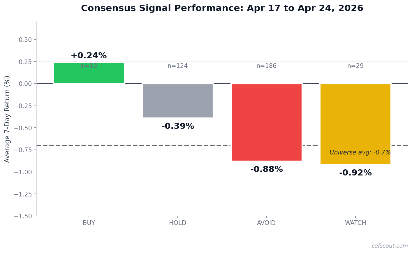 Income funds dropped this week. The universe lost 0.70%. The 19 highest-conviction Consensus BUY signals gained 0.24%. They were the only group with positive returns.